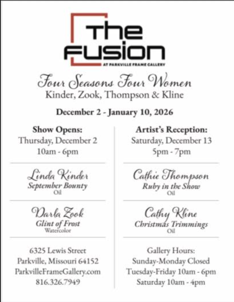 Back to All Events Four Seasons Four Women Tuesday, December 2, 2025 9:30 AM Saturday, January 10, 2026 10:30 PM 6325 Lewis Street # 115 Parkville, MO 64152 United States (map) Google Calendar ICS